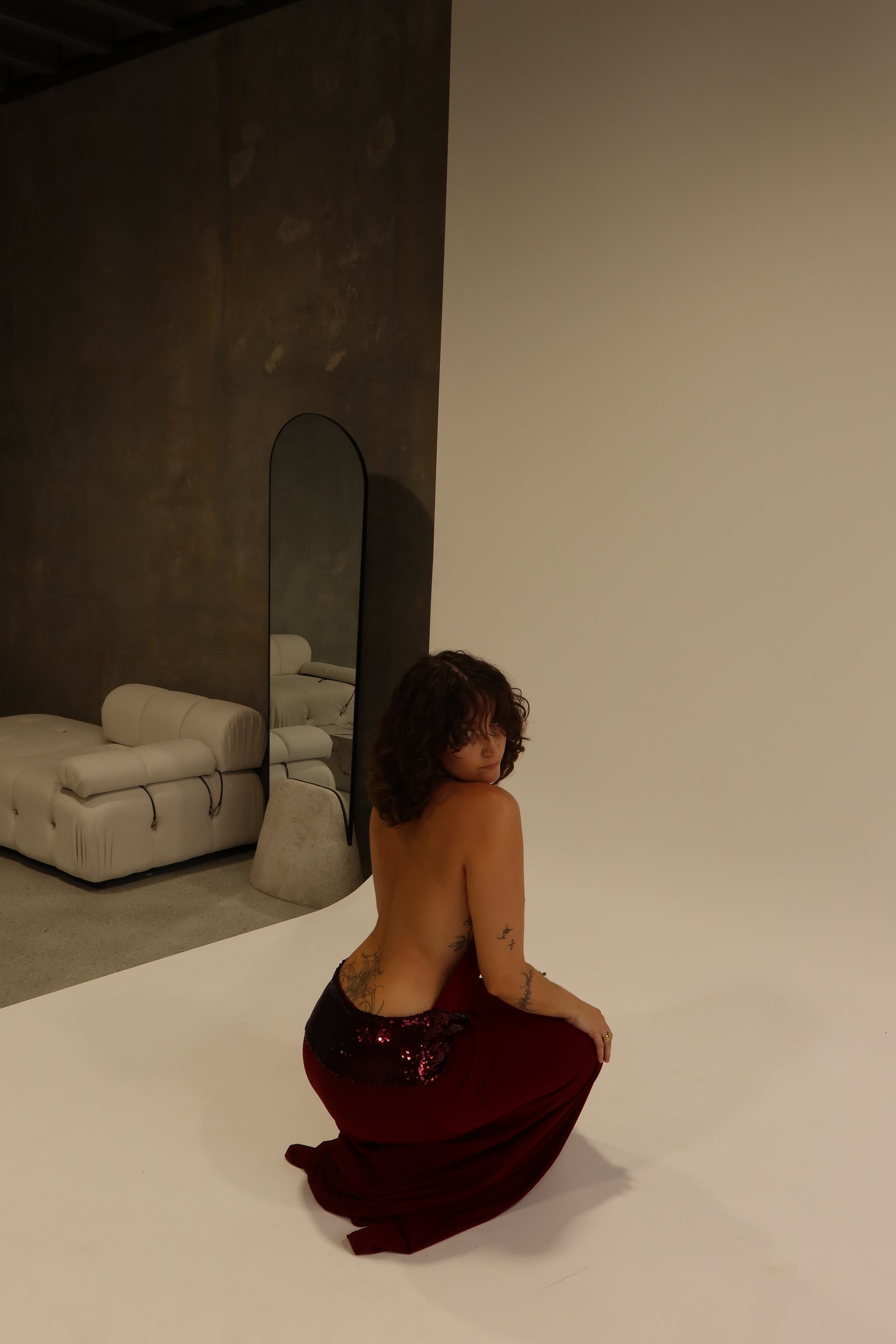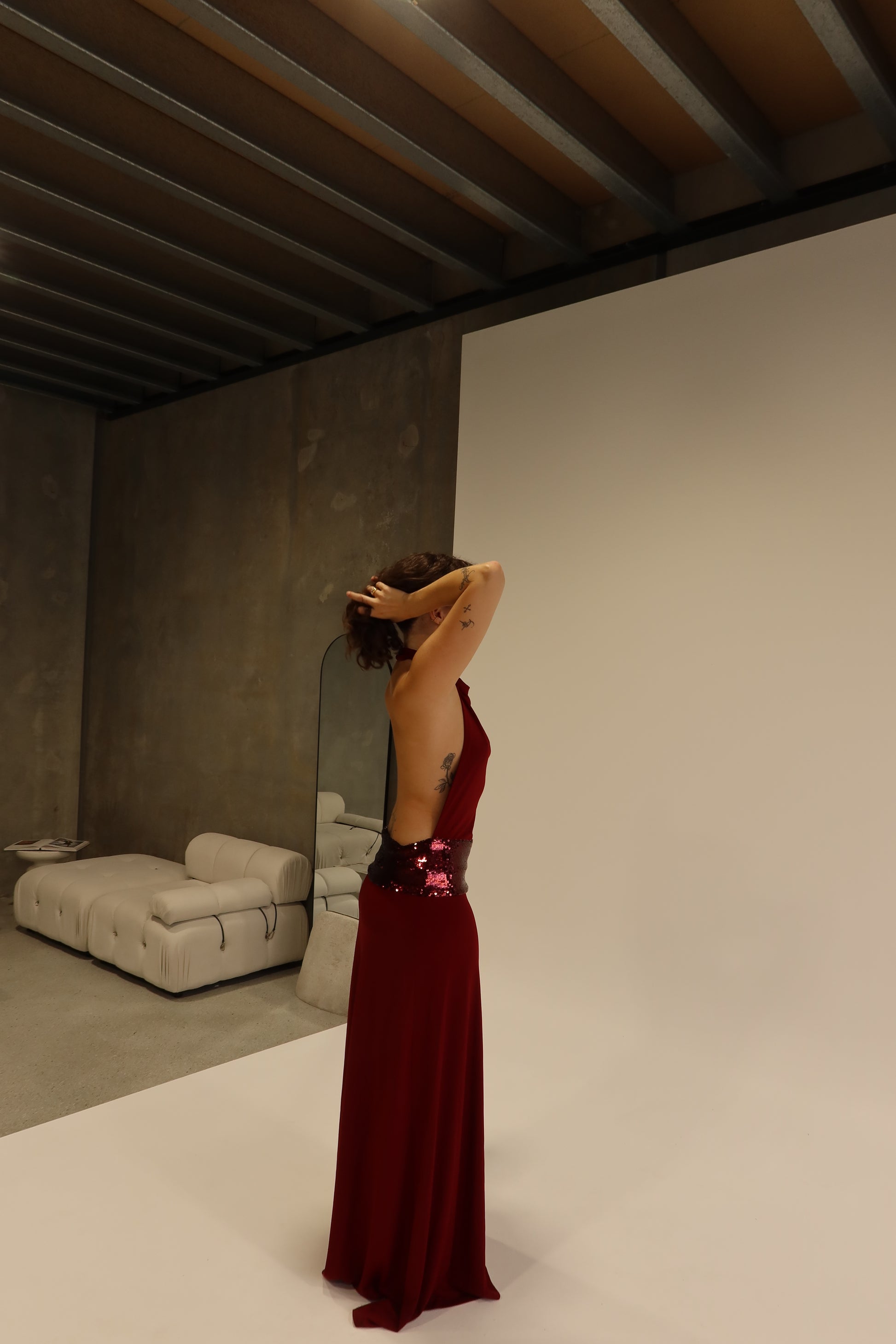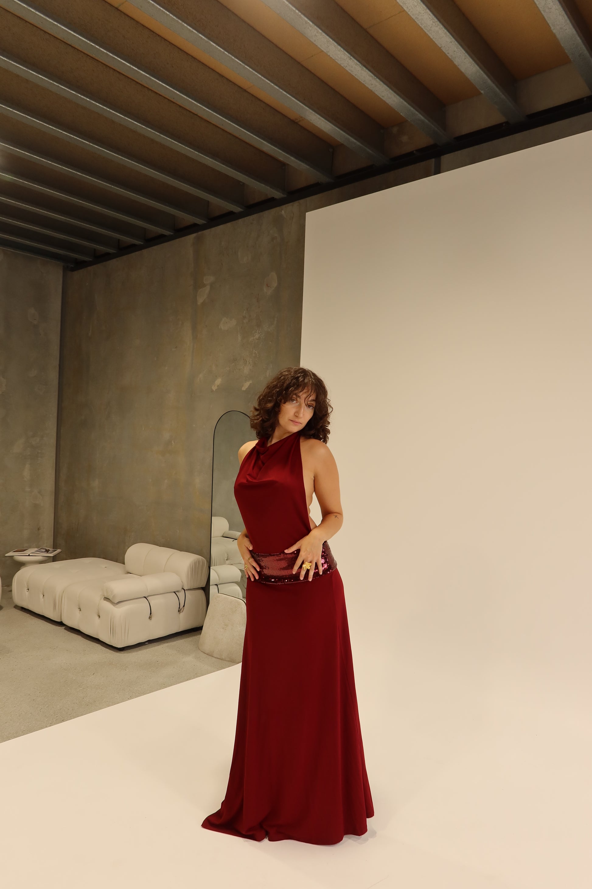 A halter gown with a draped cowl neck, open back, and low-sitting sequinned waistband that hugs the hips. The fluted skirt falls asymmetrically, flowing effortlessly as you walk.